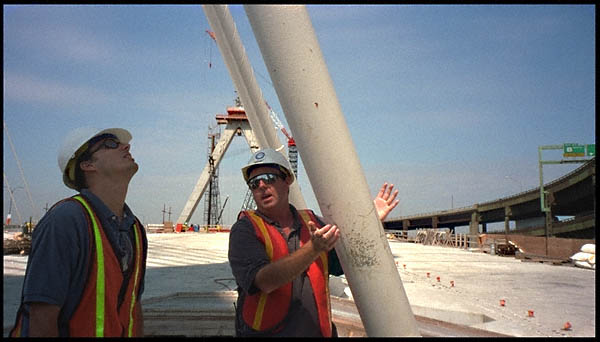 Sean explains to Sebastian Diaz about an extra protective layer of steel (a collar) at the base of the cables on the bridge. Off to the right is another view of the current I-93 elevated highway.